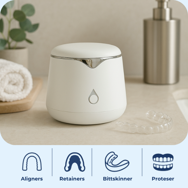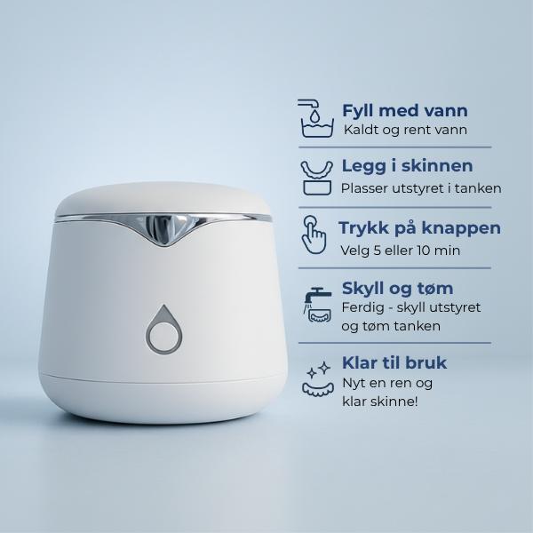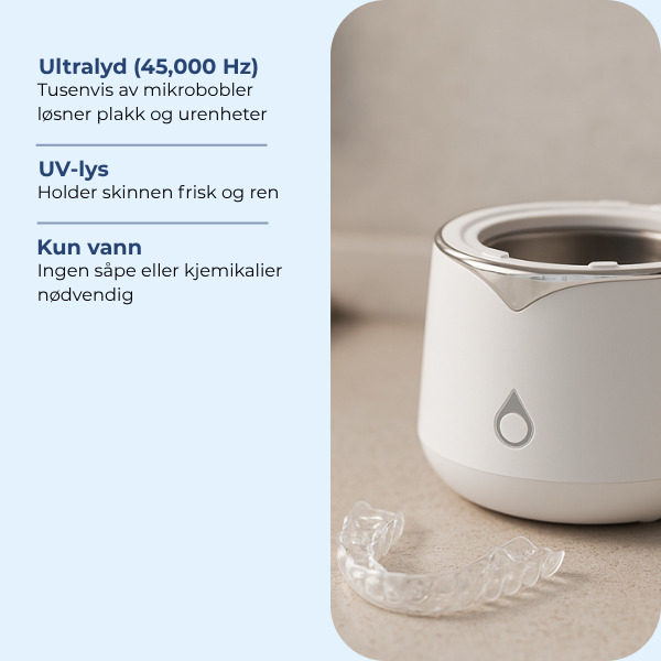 Ultralyd og UV-lys fjerner plakk og urenheter der tannbørsten ikke når - helt automatisk.
